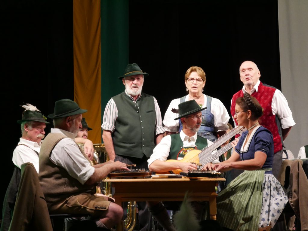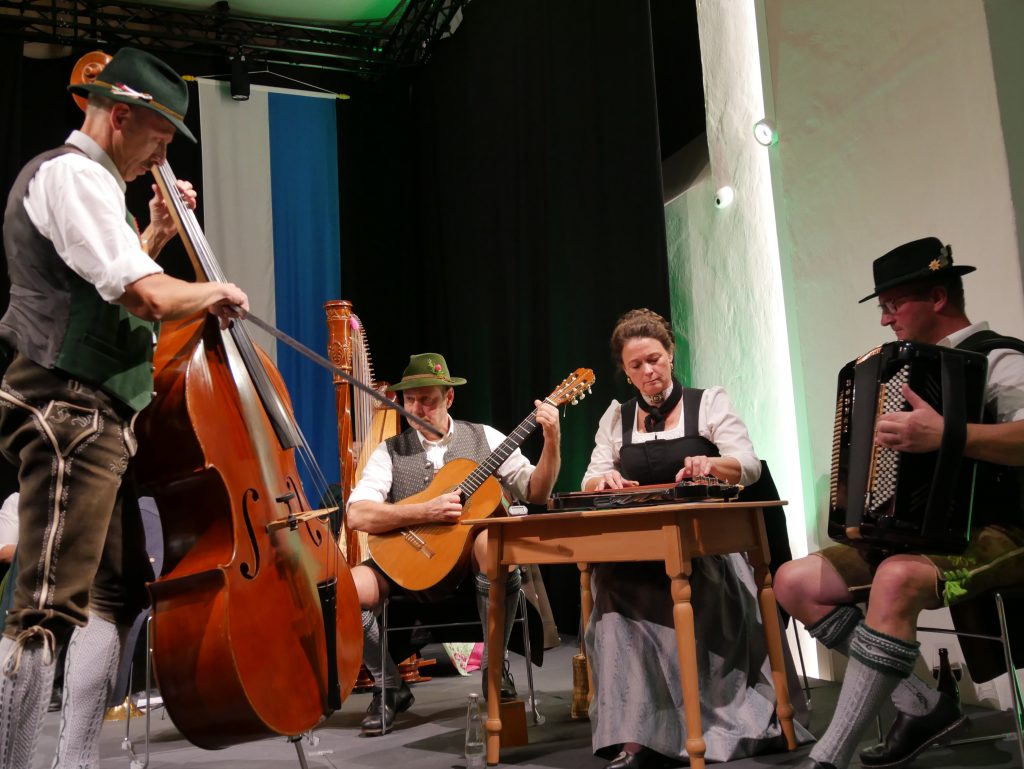Den jeweils schneidigen Auftakt der fünf Musikrunden übernahm die Diwan-Musi, ein fünfköpfiges Ensemble, bestehend aus Musikanten aus dem Gaugebiet. Besetzt mit Annemarie Anfang, Julian Senoner, Bernhard Koch, Martin Egger und Martl Wellinger gelang es ihnen mit Walzer, Marsch und Polka das Publikum musikalisch in die nächsten Runden zu führen. „Der Gesang kam mit der Liebe“, so Bettina Abstreiter, die mit ihrem Mann Klaus und Tochter Lena den „Abstreiter Dreigsang“ bilden auf Nachfrage. Das Gesangstrio bestach mit ihrem unverwechselbar feinen Klang ihrer Stimmen und der Auswahl ihrer Gesangsstücke, die vom vergangenen Sommer bis hin zum „letztl Blattl“ erzählten. Hörbar dabei die Leidenschaft und Hingabe von Markus Gromes, der den Dreigsang auf der Ziach musikalisch begleitete. Christine Ober an der Zither, Flori Seestaller am Kontrabass, Peter Holzner an der Gitarre und Falk Lexhaller an der Ziach bilden die „Dreiobermusi“ – oder, wie sie Gromes humorvoll vorstellte: drei Ober und eine Herzdame. Die Saiteninstrumente spielen bei diesem Quartett die Hauptrolle, stehen im Vordergrund. Die runden, brummig wirkenden Töne der Ziach unterstreichen dabei charmant im Hintergrund. Vielseitig haben sie mit „Boarischen“, Polka und Walzer die Bandbreite ihrer Besetzung gekonnt platziert. Seit 46 Jahren singen die „Stoaner Sänger“ schon gemeinsam. „Volksmusik ist immer schön, da kann man nichts verkehrt machen“, so Christa Steiner. Sie, ihr Ehemann Sepp Steiner und Reinhold Steiger haben schon viel erlebt, und können auf viele schöne Momente bei den zahlreichen Veranstaltungen zurückblicken, so Christa Steiner auf Nachfrage. Begleitet wurden sie von der „Boarischen Almmusi“ mit Simone Lahner auf der Zither, ihrem Mann Albert auf der Gitarre und dem Tubisten Peter Egner aus Garmisch auf, bei der sie Manfred Wörndle auf der Ziach begleitete. Wörndle gab spontan und humorvoll die Besonderheiten seines Werdenfelser Dialektes zum Besten. Passend zum Namen der Gruppe waren Musikstücke wie das „Almlüfterl“ oder auch der Leckererhäusl-Marsch zu hören. Letzteres, ein Stück, dass aus der Feder von Wörndle stammt.