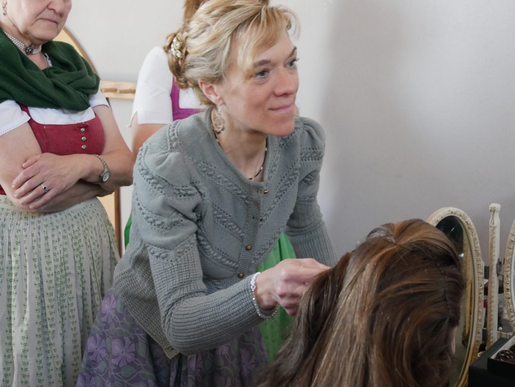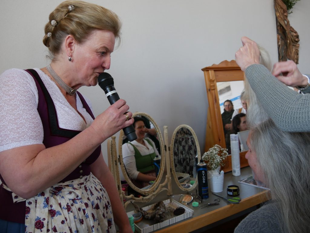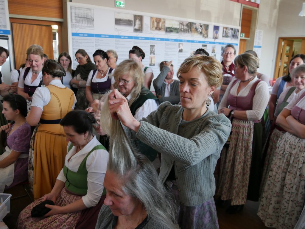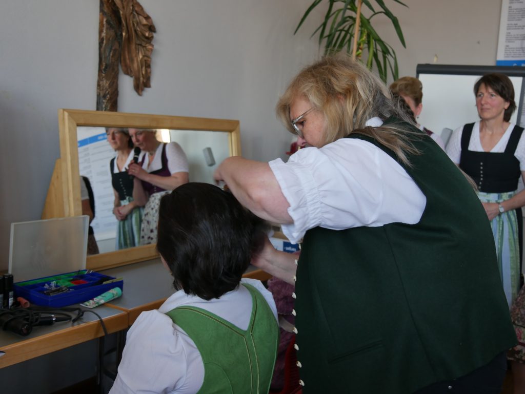 Schwabering. 50 Teilnehmerinnen, 4 Dozentinnen und am Ende strahlende Gesichter – so die Resonanz beim Seminar der Trachtenpfleger aus den Gebieten Simssee, Nördlicher Chiemgau, Mangfall und Inn-Salzach. Einen ganzen Samstag-Nachmittag durften die anwesenden Frauen Modell stehen und so manche für sie noch unbekannte Frisur erproben. Mit der Friseurin Vroni König aus Übersee, die neben ihrem Fachwissen mit reichlich Zöpfen und Zubehör ausgestattet war, konnten noch Kathi Schnaiter und Bernadette Schnitzlbaumer reichlich Fachwissen vermitteln. Darin ging es von der richtigen Farbausauswahl der Zöpfe, deren Pflege natürlich im Besonderen um das Hochstecken. Vom „Gredei“ bis zum Schopf – je nach vereins- und ortsüblichen Anforderungen gelang es, für jede Frau die passende Hochsteckfrisur zu gestalten. Die passenden, reichlich und kostbar bestickten Samtbänder, die bei der Gredl-Frisur zum Einsatz kommen stellte Elisabeth Krier aus Schwabering vor. Während die einen den Dozentinnen über die Schulter blicken konnten, moderierte Irmi Impler, Sachgebietsleiterin der Trachtenpflege unseres Gauverbandes gekonnt, so dass reichlich Tipps und Anregungen mit nach Hause genommen werden konnten. Denn, so die Anmerkung von Irmi, dieser Kurs und das vermittelte Wissen und Können sollen als Anregung dienen, um es in den Vereinen an die Mitglieder weiterzugeben.