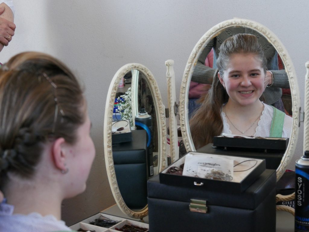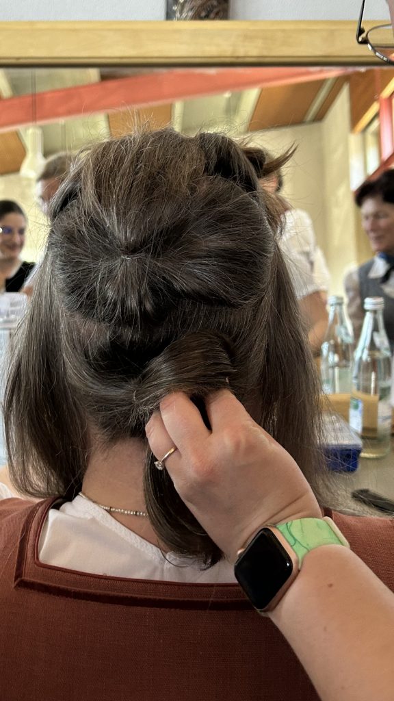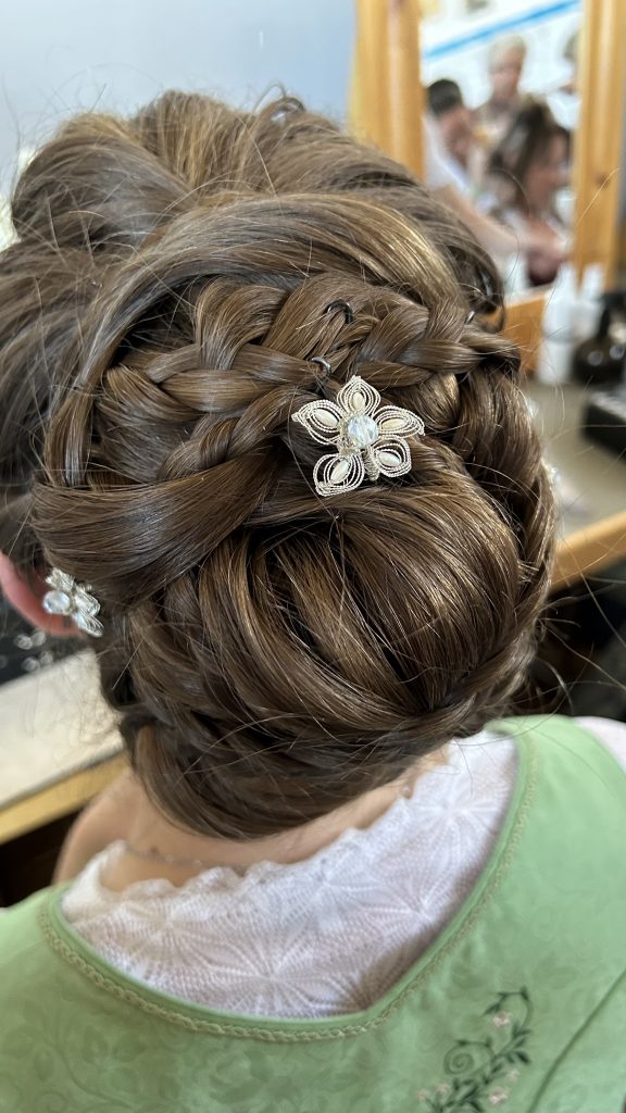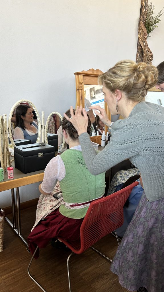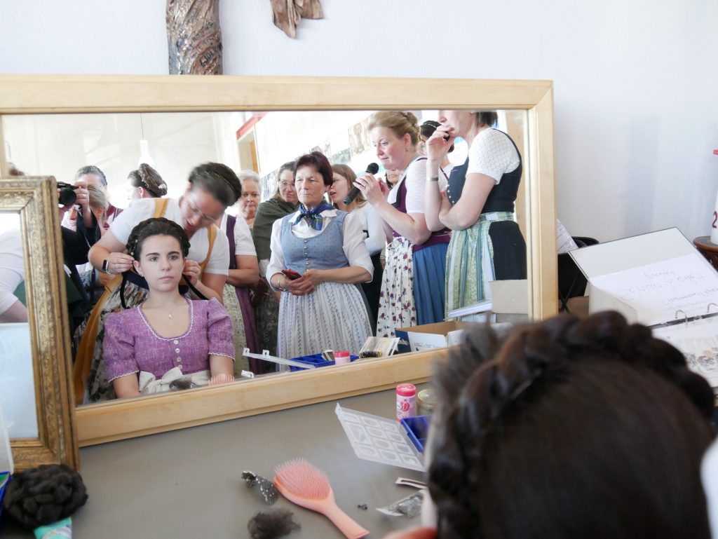 Schwabering. 50 Teilnehmerinnen, 4 Dozentinnen und am Ende strahlende Gesichter – so die Resonanz beim Seminar der Trachtenpfleger aus den Gebieten Simssee, Nördlicher Chiemgau, Mangfall und Inn-Salzach. Einen ganzen Samstag-Nachmittag durften die anwesenden Frauen Modell stehen und so manche für sie noch unbekannte Frisur erproben. Mit der Friseurin Vroni König aus Übersee, die neben ihrem Fachwissen mit reichlich Zöpfen und Zubehör ausgestattet war, konnten noch Kathi Schnaiter und Bernadette Schnitzlbaumer reichlich Fachwissen vermitteln. Darin ging es von der richtigen Farbausauswahl der Zöpfe, deren Pflege natürlich im Besonderen um das Hochstecken. Vom „Gredei“ bis zum Schopf – je nach vereins- und ortsüblichen Anforderungen gelang es, für jede Frau die passende Hochsteckfrisur zu gestalten. Die passenden, reichlich und kostbar bestickten Samtbänder, die bei der Gredl-Frisur zum Einsatz kommen stellte Elisabeth Krier aus Schwabering vor. Während die einen den Dozentinnen über die Schulter blicken konnten, moderierte Irmi Impler, Sachgebietsleiterin der Trachtenpflege unseres Gauverbandes gekonnt, so dass reichlich Tipps und Anregungen mit nach Hause genommen werden konnten. Denn, so die Anmerkung von Irmi, dieser Kurs und das vermittelte Wissen und Können sollen als Anregung dienen, um es in den Vereinen an die Mitglieder weiterzugeben.